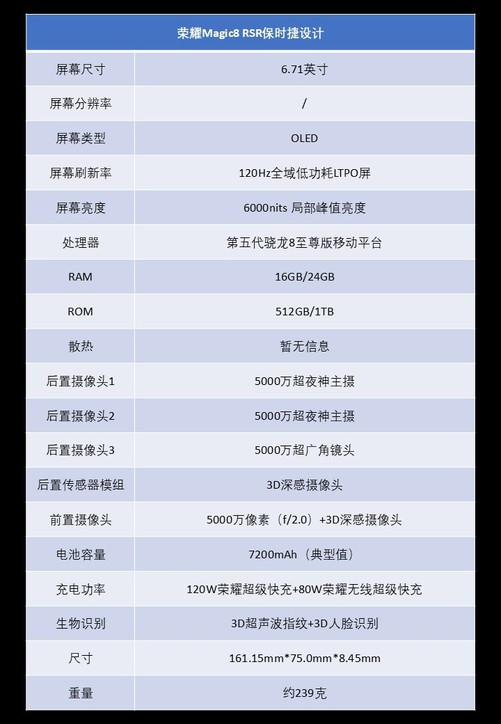 在影像之外,荣耀Magic8RSR保时捷设计的硬件配置也维持了超旗舰应有的水准。其搭载骁龙8EliteGen5处理器,最高可选24GB内存和1TB存储容量,能够满足高负载应用、多任务处理以及大型游戏的性能需求。
